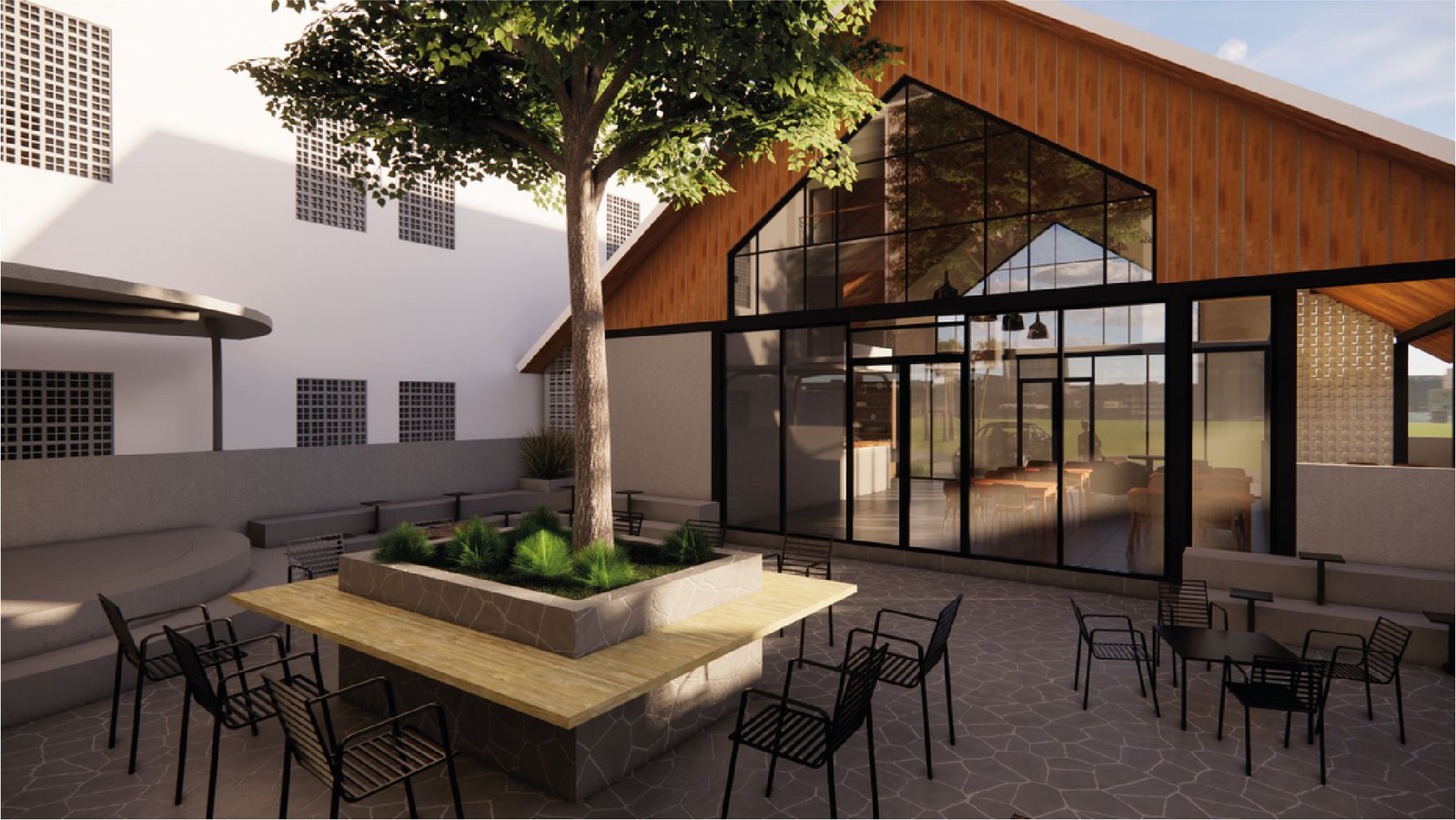 Menampilkan desain tropis modern yang mengundang, Sabine Eat and Co. berdiri sebagai oase bersantai di tengah kawasan Gamping. Bangunan dengan fasad atap pelana simetris dan permainan roster serta elemen kayu ini menciptakan nuansa hangat dan terbuka. Ruang dalam dan area taman belakang diatur selaras untuk menciptakan alur sirkulasi pengunjung yang alami, mendukung pengalaman makan yang nyaman baik di dalam maupun luar ruangan.